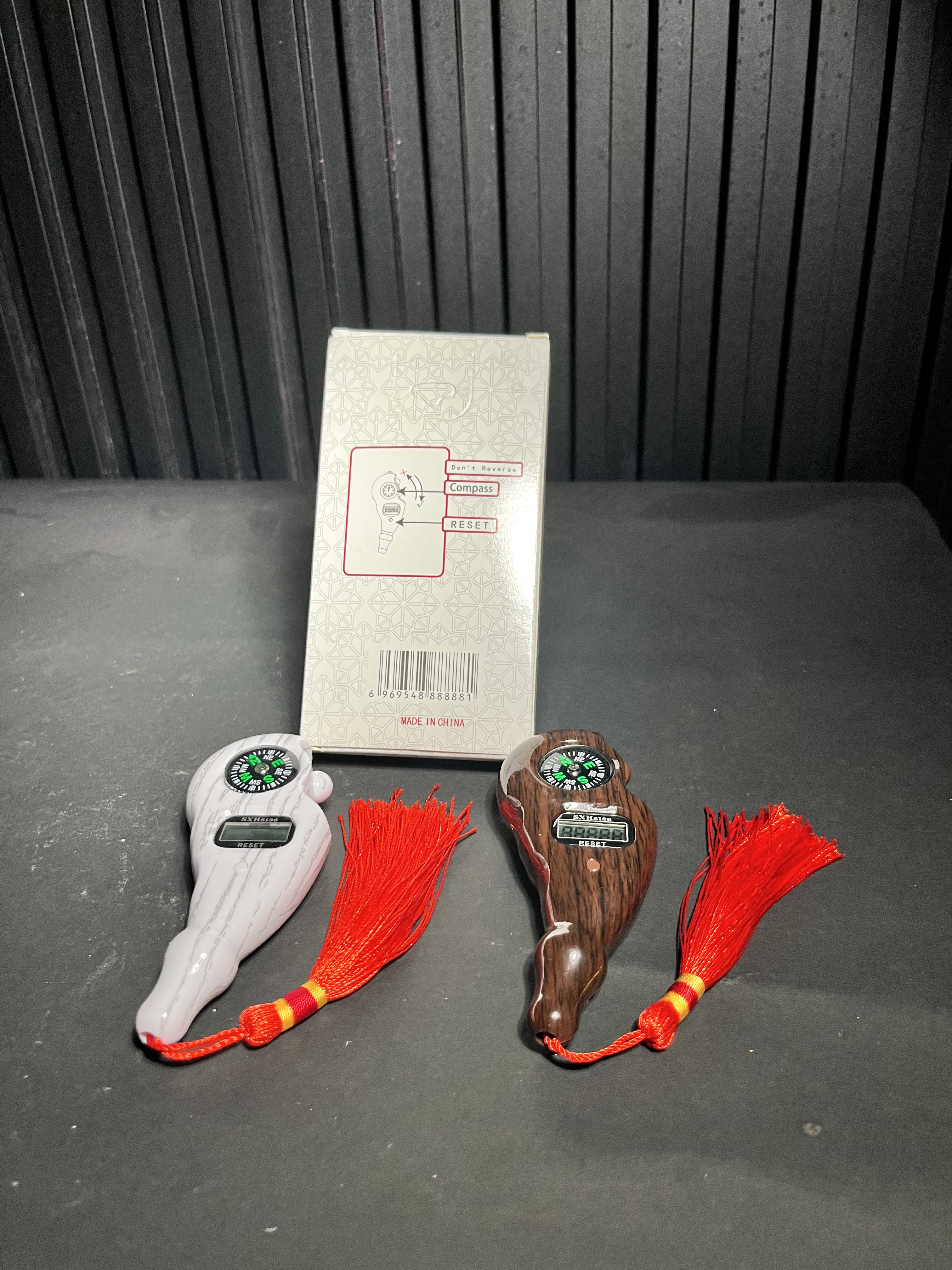 This Digital Tasbih & Compass is an elegant and modern Islamic prayer counter designed in the shape of a hand (kaf). It combines traditional dhikr counting with a built-in analog compass, making it a perfect companion for daily prayers and travel. The device features an LCD digital display that accurately counts each press, along with a reset button to start fresh. A decorative red tassel with gold and red wrapping adds a classic touch.