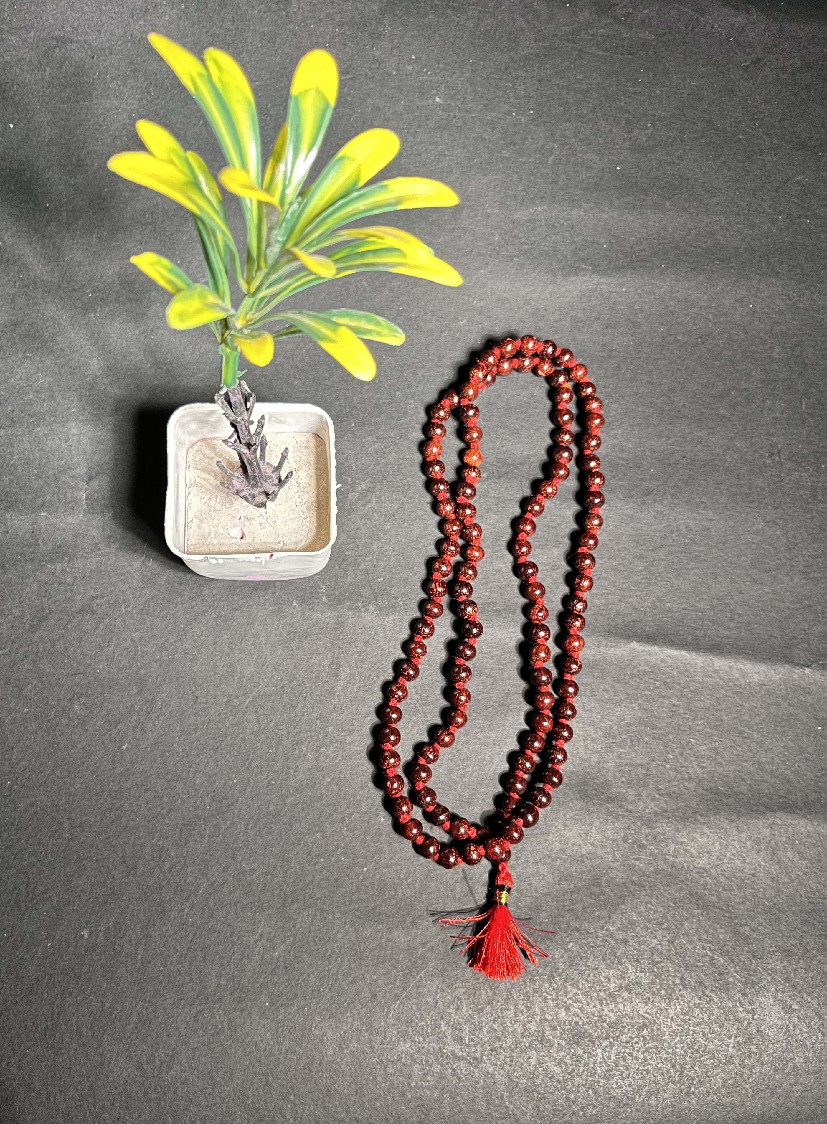 Authentic Red Sandalwood 108-bead japa mala with red tassel. Ideal for daily meditation, mantra chanting, and spiritual practice. Smooth, fragrant, sacred beads.