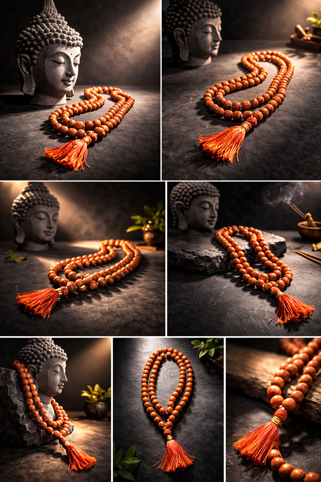 Premium natural Rudraksha 108-bead japa mala with red tassel. Perfect for daily mantra chanting, meditation, and spiritual worship. Sacred and authentic.