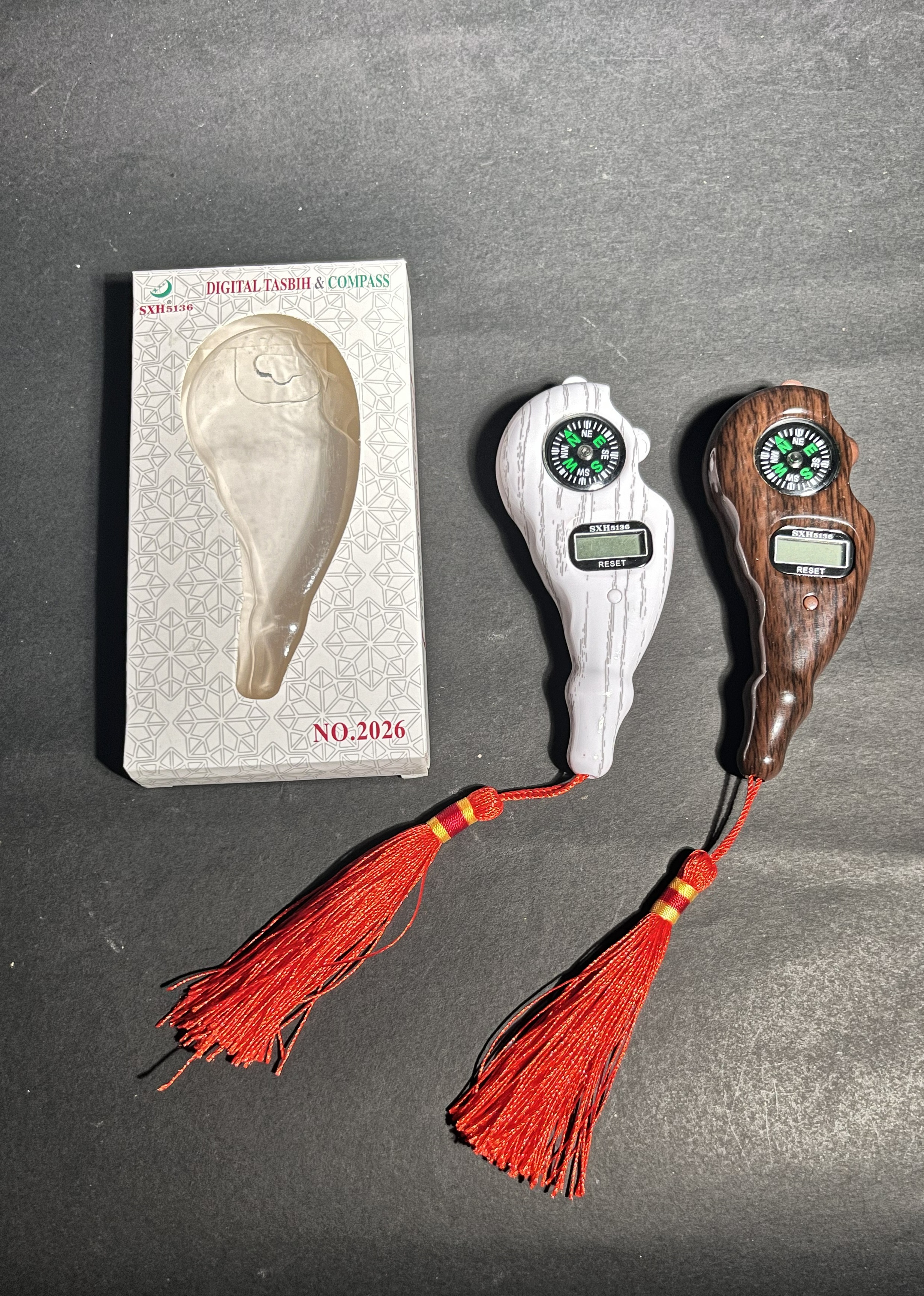 This Digital Tasbih & Compass is an elegant and modern Islamic prayer counter designed in the shape of a hand (kaf). It combines traditional dhikr counting with a built-in analog compass, making it a perfect companion for daily prayers and travel. The device features an LCD digital display that accurately counts each press, along with a reset button to start fresh. A decorative red tassel with gold and red wrapping adds a classic touch.